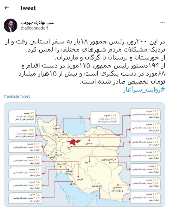 به گزارش ایرنا، علی بهادری جهرمی روز سهشنبه در توئیتی در خصوص سفرهای استانی رییس جمهوری نوشت: در این ۲۰۰روز، رئیس جمهور ۱۸بار به سفر استانی رفت و از نزدیک مشکلات مردم شهرهای مختلف را لمس کرد. از خوزستان و لرستان تا گرگان و مازندران. از ۱۹۳ دستور رئیس جمهور، ۱۲۵مورد در دست اقدام و ۶۸ مورد در دست پیگیری است و بیش از ۱۵هزار میلیارد تومان تخصیص صادر شده است.